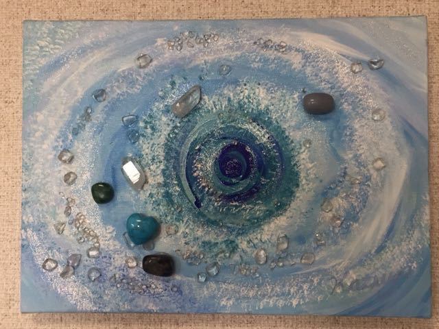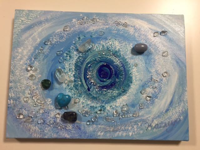 贅沢にブルー系のクリスタルをコラージュした作品。